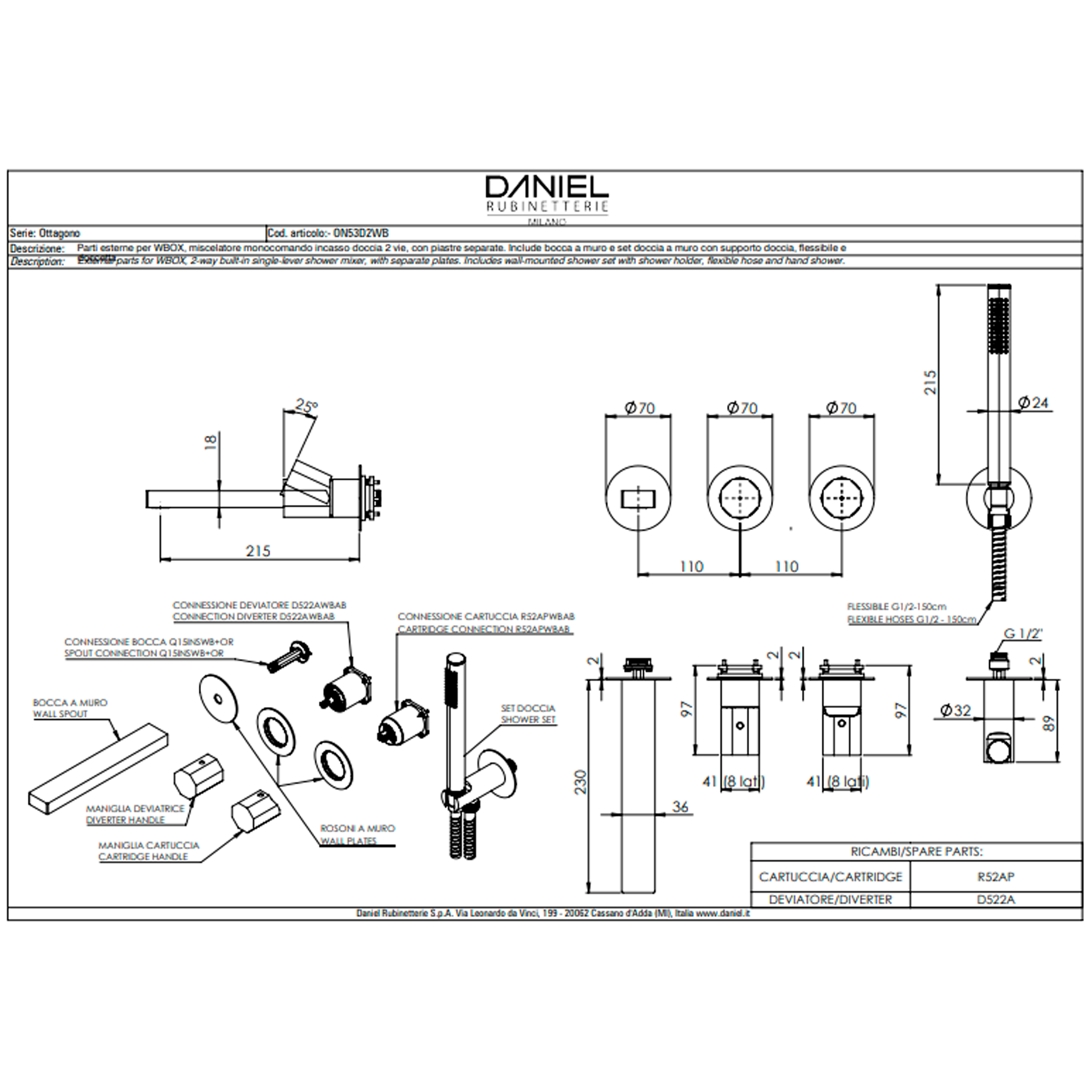 Смеситель для ванны Remer Ottagono ON53D2PWBGP, золото глянцевое PVD