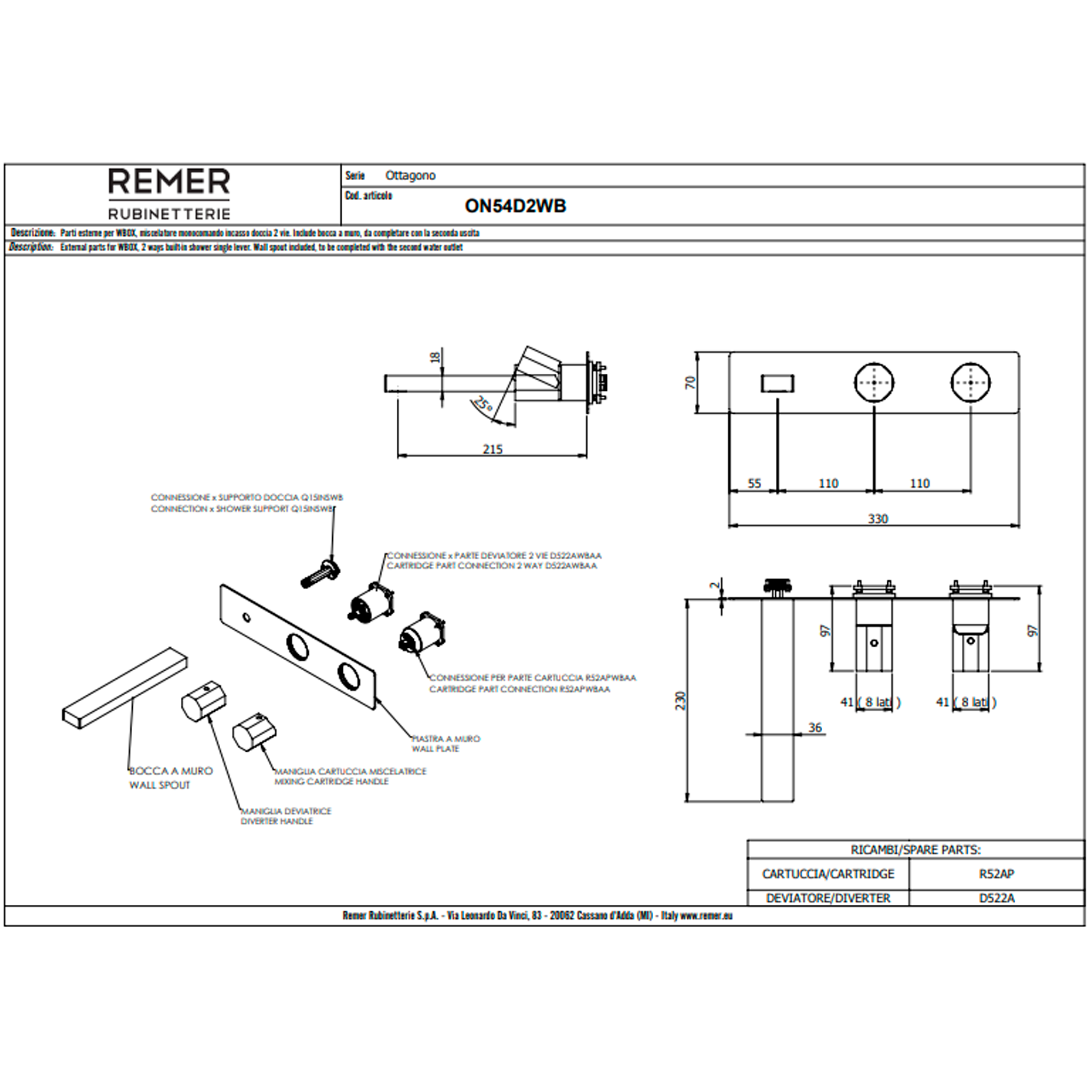 Смеситель для ванны Remer Ottagono ON54D2WBGP, золото глянцевое PVD