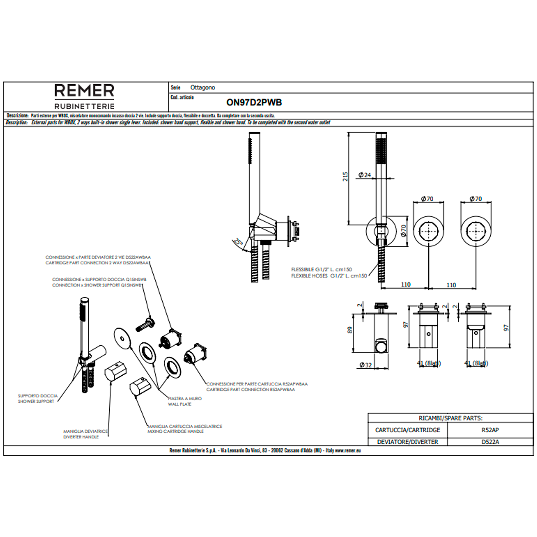 Смеситель для душа Remer Ottagono ON97D2PWBCU, медь брашированная PVD