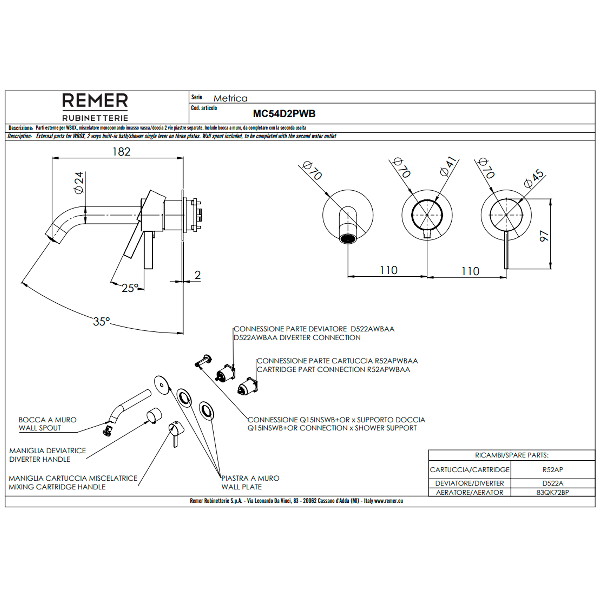 Смеситель для ванны Remer Metrica MC54D2PWBXV, сталь