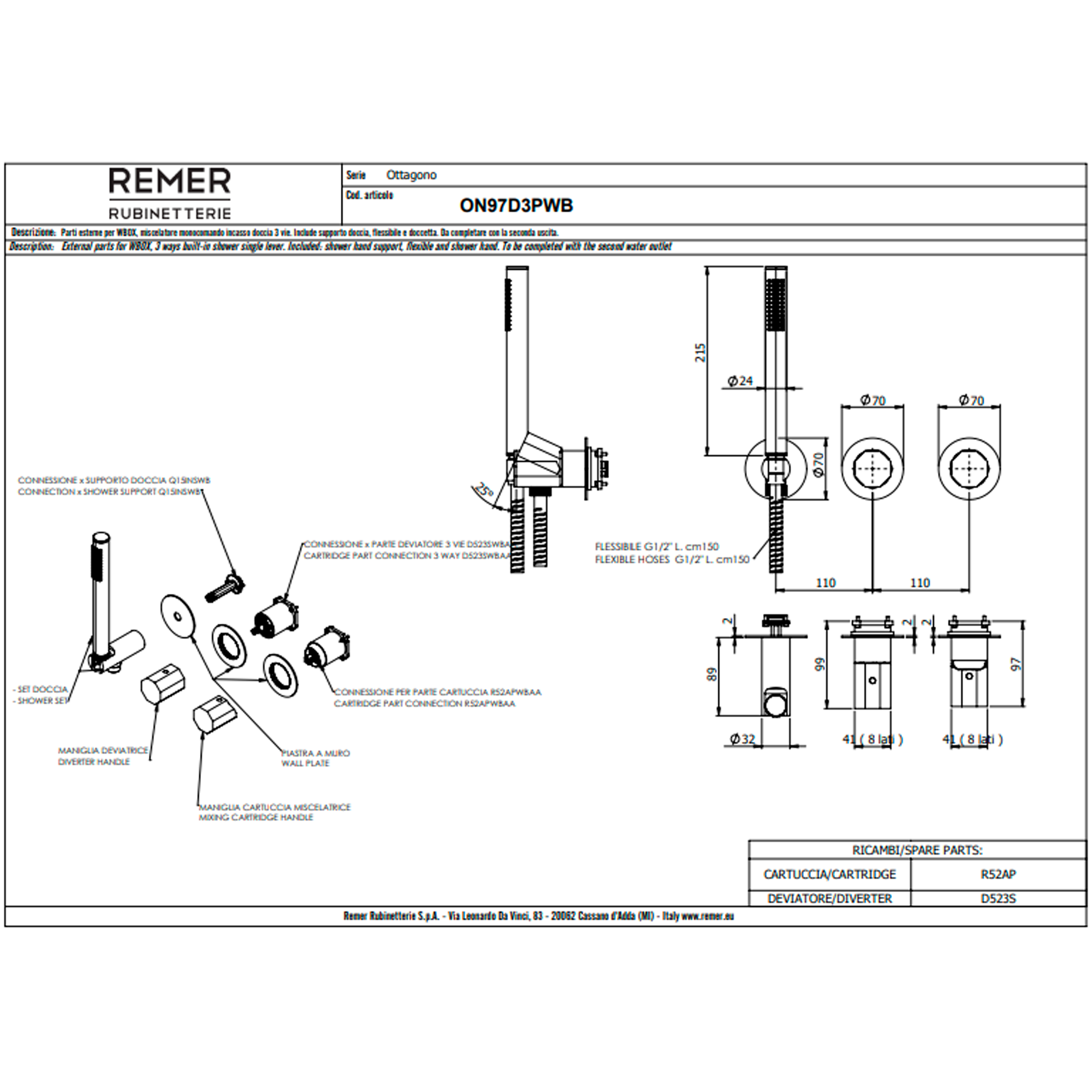 Смеситель для душа Remer Ottagono ON97D3PWBRP, медь брашированная