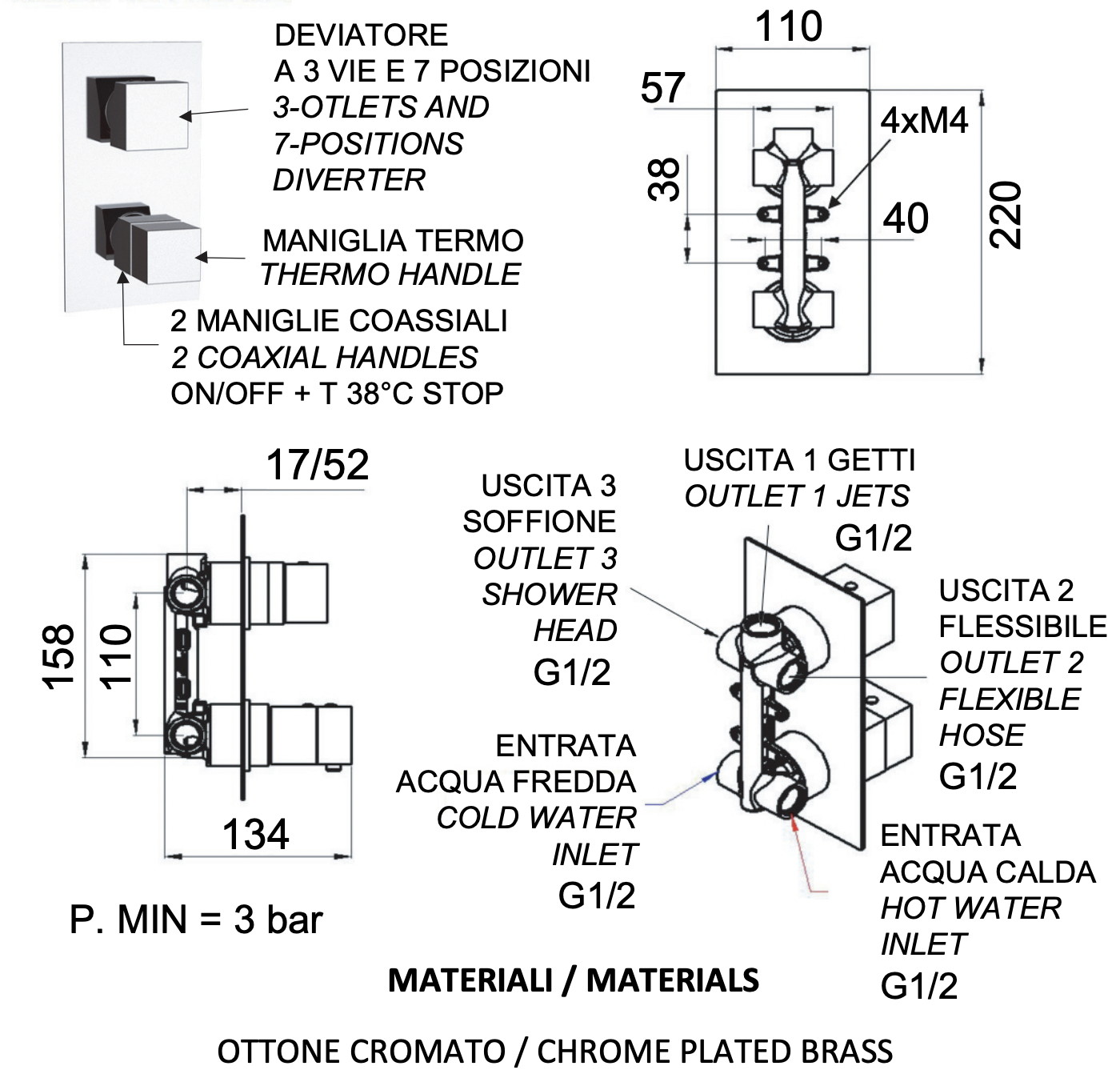 Смеситель термостатический для душа Remer Q-Elegance QT937, 3 выхода и 7 положений