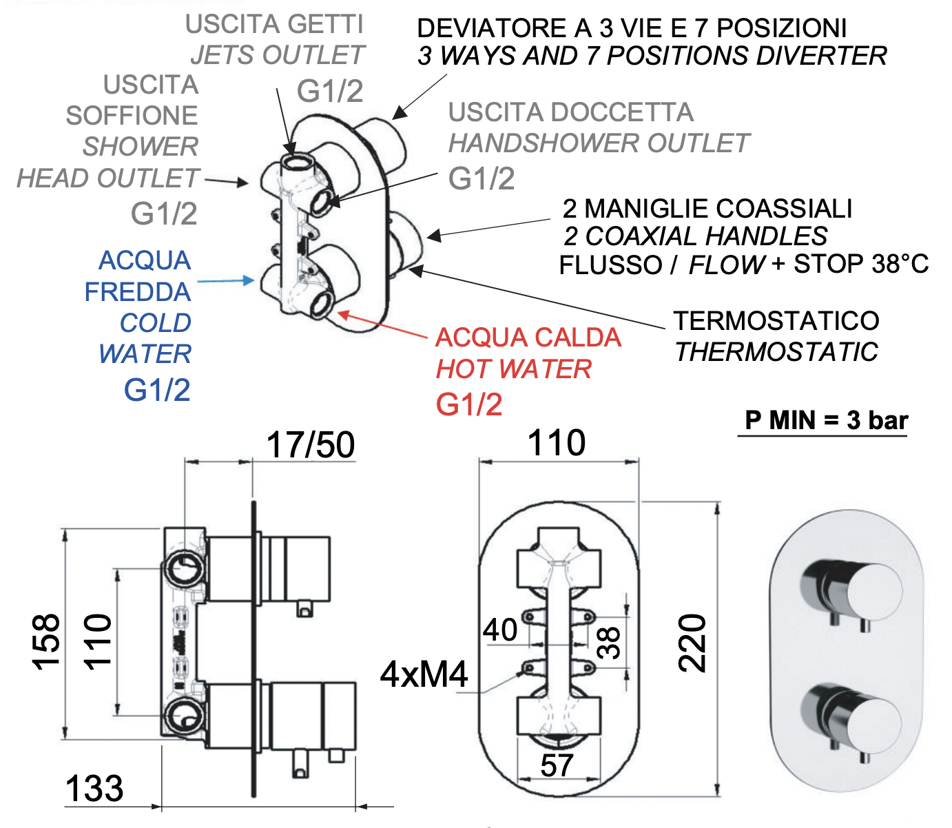 Смеситель термостатический для душа Remer Elegance NT937, 3 выхода и 7 положений